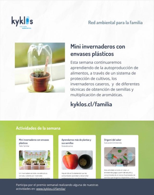 ACTIVIDAD DE LA SEMANA KYKLOS – MINI INVERNADEROS CON ENVASES PLÁSTICOS Estimados estudiantes y familia, los invitamos a participar de la actividad semanal de la plataforma Kyklos. https://www.kyklos.cl/familia/ Volver