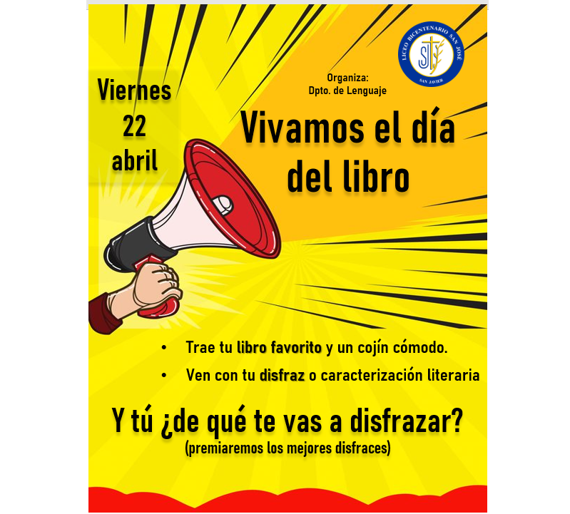 Estimados y estimadas estudiantes, el Departamento de Lenguaje te invita a participar de la conmemoración del Día del Libro y Derecho de Autor. Te esperamos el día viernes 22 de abril con tu mejor caracterización del personaje de tu libro, cuento, novela, etc. favorito. Además, puedes traer un cojín para que disfrutemos de un grato momento de lectura al aire libre.