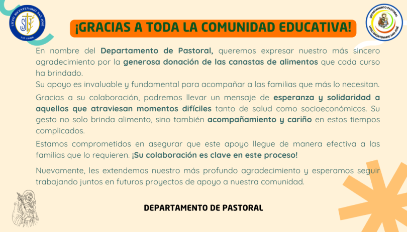 DEPTO. PASTORAL – ¡GRACIAS A TODA LA COMUNIDAD EDUCATIVA!