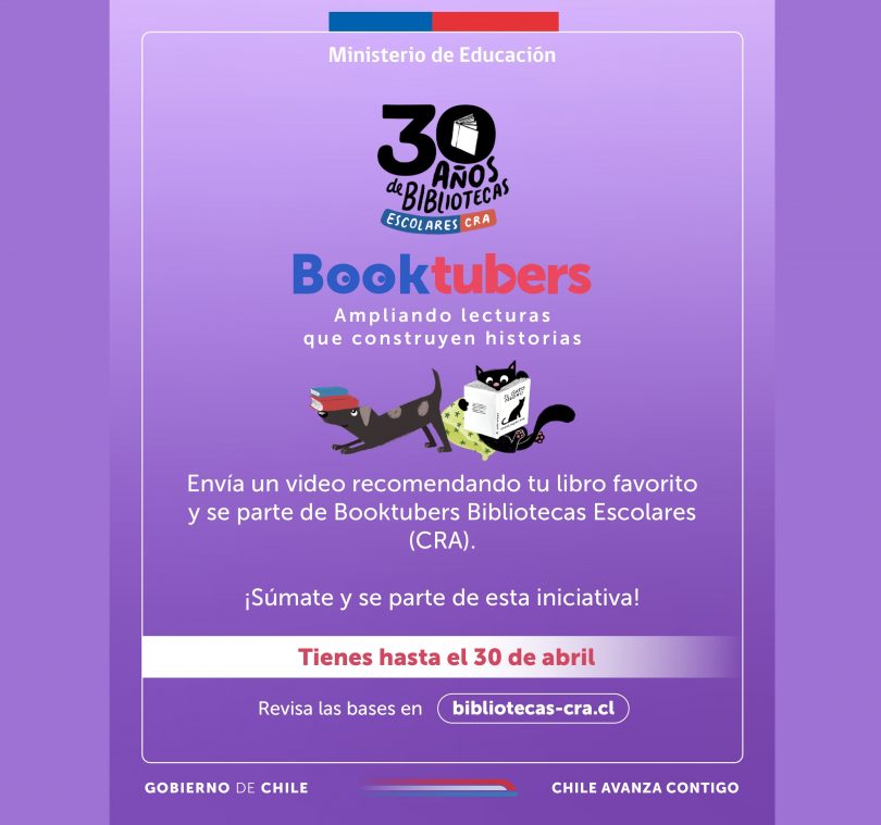 Estimados estudiantes de pre básica a 4° medio los invitamos a ser parte de este concurso que organiza el ministerio de educación para celebrar los 30 años de la existencia de las bibliotecas CRA consiste en grabar un video recomendando un libro de la biblioteca escolar (CRA) de su establecimiento educativo u otro título de lectura personal que sea pertinente al contexto escolar y acorde a la edad de quien lo presenta. El objetivo de esta iniciativa es motivar y fomentar la lectura entre pares con la temática: «Ampliando lecturas que construyen historias«.