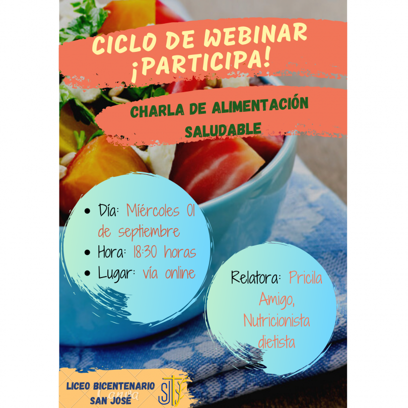 Querida comunidad educativa de nuestro Liceo Bicentenario San José: Queremos invitarlos a participar de una charla sobre alimentación saludable, que nos permitirá reflexionar y fomentar nuestros hábitos alimenticios, aspecto importante para propiciar nuestro bienestar personal. A dicho encuentro, puede participar tanto el apoderado, estudiantes, docentes y asistentes de la educación, ya que es una instancia formativa y de aprendizaje para toda nuestra comunidad educativa. La charla se realizará el día miércoles 01 de septiembre a las 18:30 horas.