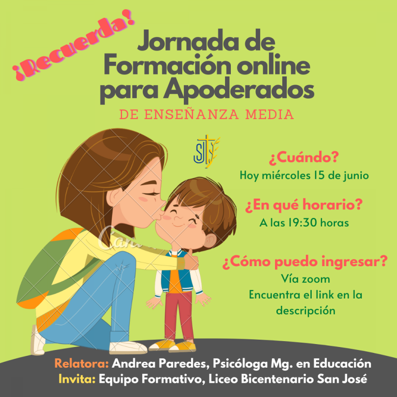 Junto con saludar y esperando que se encuentren bien, tengo a bien informar que hoy día miércoles 15 de junio a las 19:30 horas sostendremos una jornada online de formación por parte de la Psicóloga Andrea Paredes correspondiente al tema «Conversaciones poderosas con hijos/as adolescentes». Dicha acción se efectuará de manera semestral, al igual que el año pasado. Es de relevancia su asistencia y participación a la jornada online, para generar procesos de reflexión y formación a nivel de apoderados en el ámbito socioemocional.