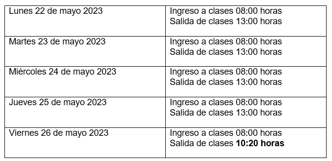 Mediante el presente, tengo bien informar a ustedes que, durante la semana del 22 al 26 de mayo del año en curso, existirá una modificación de horarios de clases para los estudiantes, debido a Capacitación de nuestros docentes.