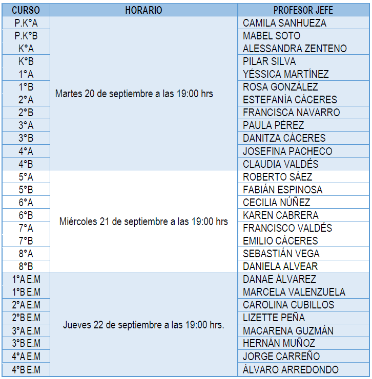 Lo anterior, será reforzado por cada uno/a de los profesores orientadores con jefatura de curso al momento de la citación. A continuación, se presenta el calendario de las reuniones.