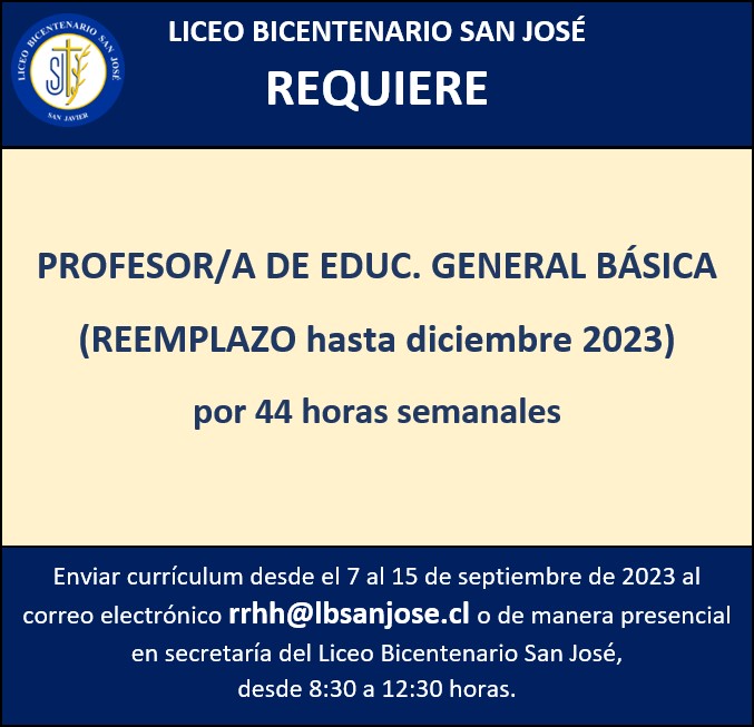 LBSANJOSÉ REQUIERE: PROFESOR/A DE EDUC. GENERAL BÁSICA
