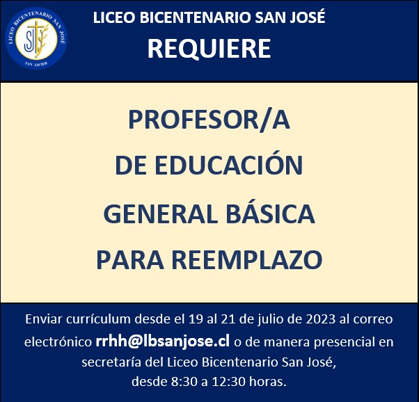 LBSANJOSÉ REQUIERE: PROFESOR DE EDUCACIÓN GENERAL BÁSICA – PARA REEMPLAZO