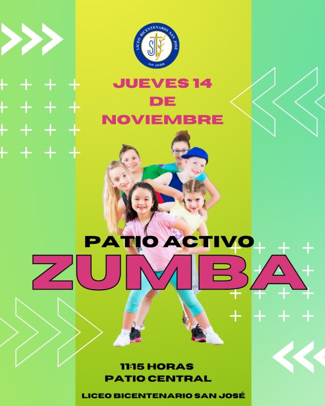Junto con saludarles, queremos invitarlos a participar del patio activo de Zumba , que se realizará el día jueves 14 de noviembre en el segundo recreo. Esta actividad se ejecuta con la finalidad de favorecer la actividad física, espacios de esparcimiento y convivencia escolar entre los estudiantes y comunidad educativa de nuestro establecimiento.