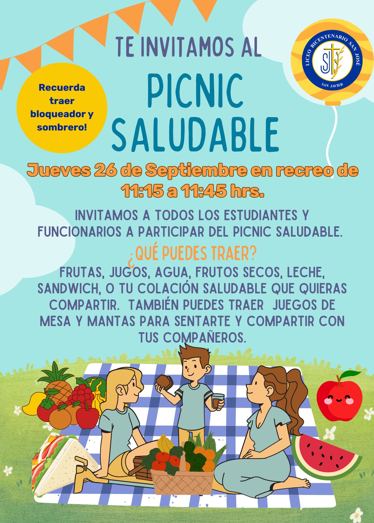 Con alegría invitamos a todos los estudiantes y funcionarios a participar del Picnic Saludable este jueves 26 de septiembre en recreo de 11:15 a 11:45 horas en nuestro Liceo Bicentenario San José. Los estudiantes deberán organizarse como curso para traer mantas, cojines, juegos de mesa u otros, para compartir y disfrutar de una actividad al aire libre.