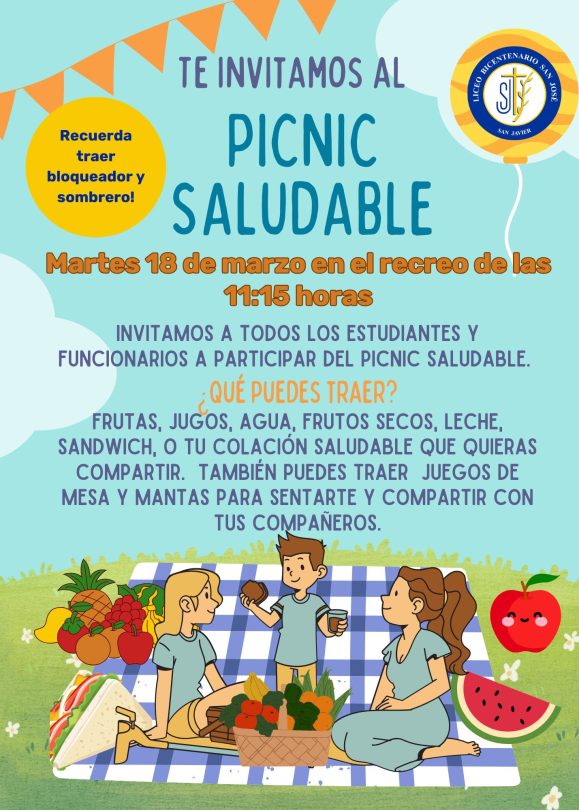 Con alegría invitamos a todos nuestros estudiantes y funcionarios a participar del Picnic Saludable a realizarse el próximo martes 18 de marzo en recreo de 11:15 a 11:45 horas en nuestro Liceo Bicentenario San José. Los estudiantes deberán organizarse como curso para traer mantas, cojines, juegos de mesa u otros, para compartir y disfrutar de una actividad al aire libre. Las ubicaciones serán el patio central, patio verde y gimnasio de básica, las cuales serán designadas el día de la actividad.