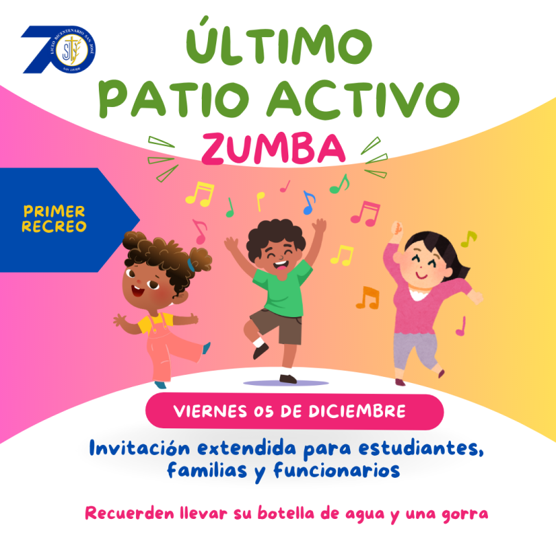 Junto con saludarles cordialmente, queremos invitarles con mucha energía y alegría a participar del último Patio Activo de Zumba del año, una instancia pensada para mover el cuerpo, compartir y cerrar el año con buena vibra 😊