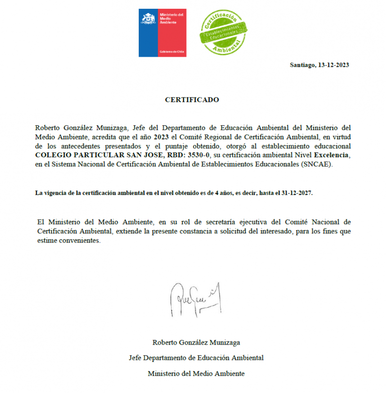 El Liceo Bicentenario San José de San Javier se enorgullece en anunciar a toda la comunidad educativa un logro extraordinario: ¡La Certificación Ambiental Nivel Excelencia en el Sistema Nacional de Certificación Ambiental de Establecimientos Educativos, con un nivel de 4 años! Esto como producto del proceso de postulación que consistió en 3 etapas, desarrolladas en el periodo de marzo a septiembre del año 2023, las etapas fueron: autoevaluación, recolección de datos y evidencia; informe de revalidación.
