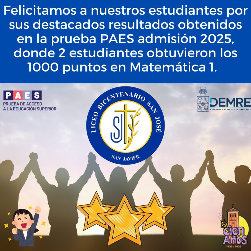 El día de hoy se dieron a conocer los resultados de la Prueba de Acceso a la Educación Superior (PAES), donde nuestros estudiantes destacaron por su excelente desempeño, reflejando el esfuerzo conjunto de alumnos, docentes y familias en la búsqueda de la excelencia académica y concretar sus proyectos de vida.